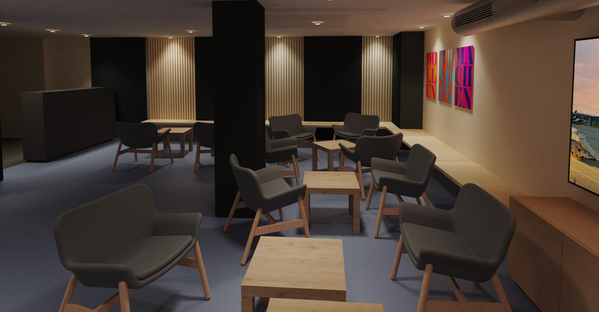 Der Lounge-Bereich schafft bewusst einen Kontrast: ruhiger, weicher, einladend. Eine umlaufende Eckbank, kleine Tische und bequeme Sessel laden zum Verweilen ein – ob für Gespräche, Spiele oder entspannte Abende. Warme, dunklere Farbtöne und gezielte Lichtakzente verleihen dem Raum eine angenehme, wohnliche Atmosphäre, die besonders am Abend zur Geltung kommt.