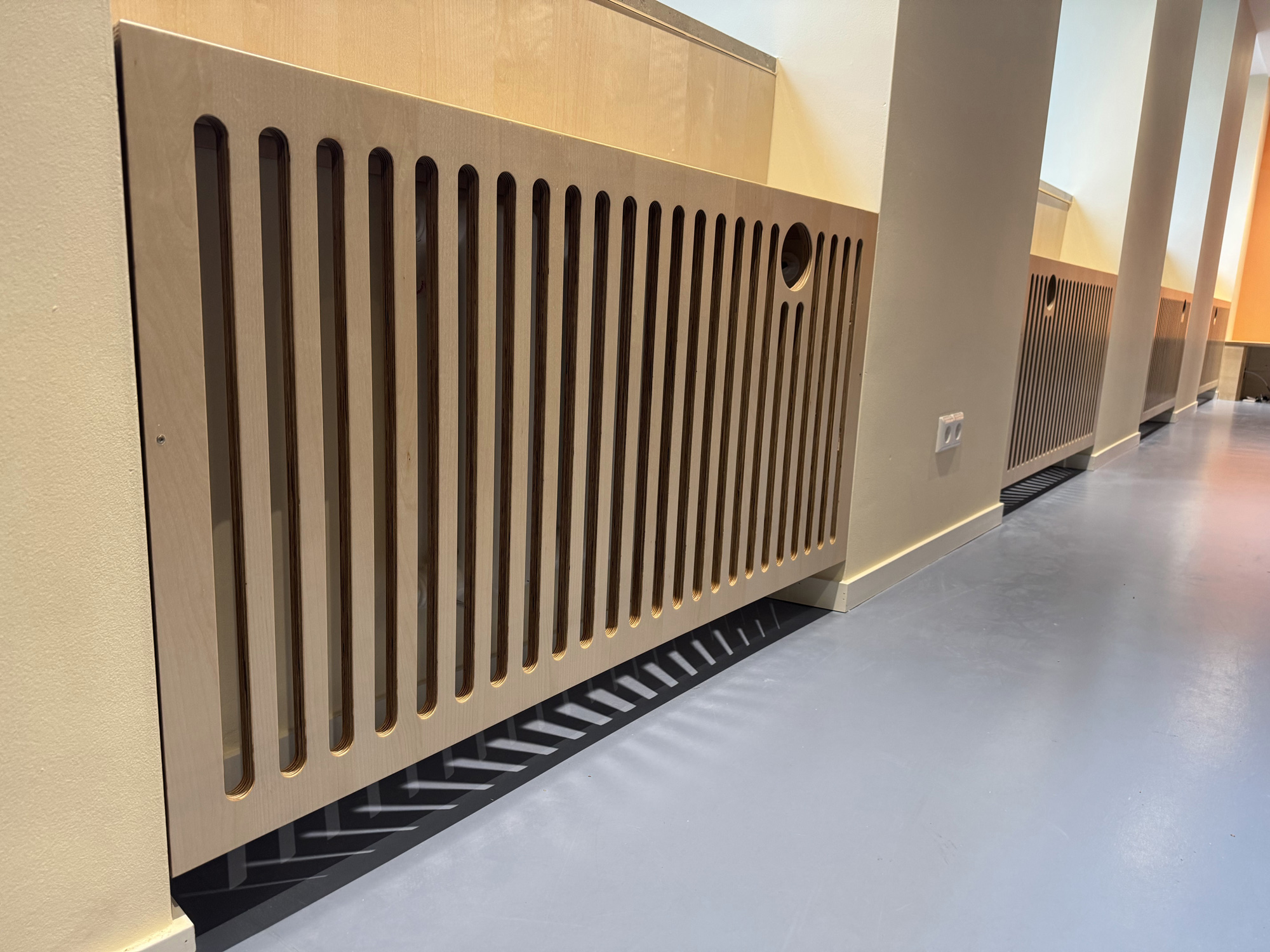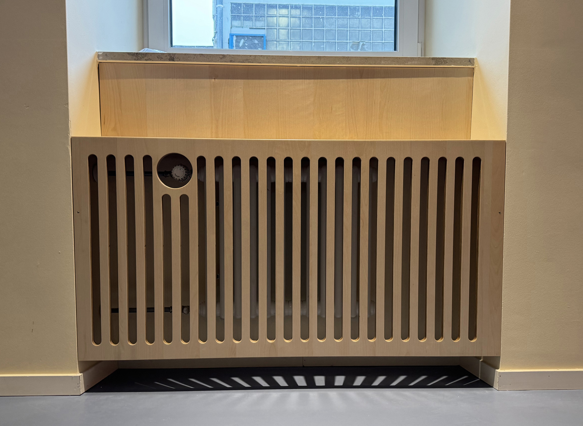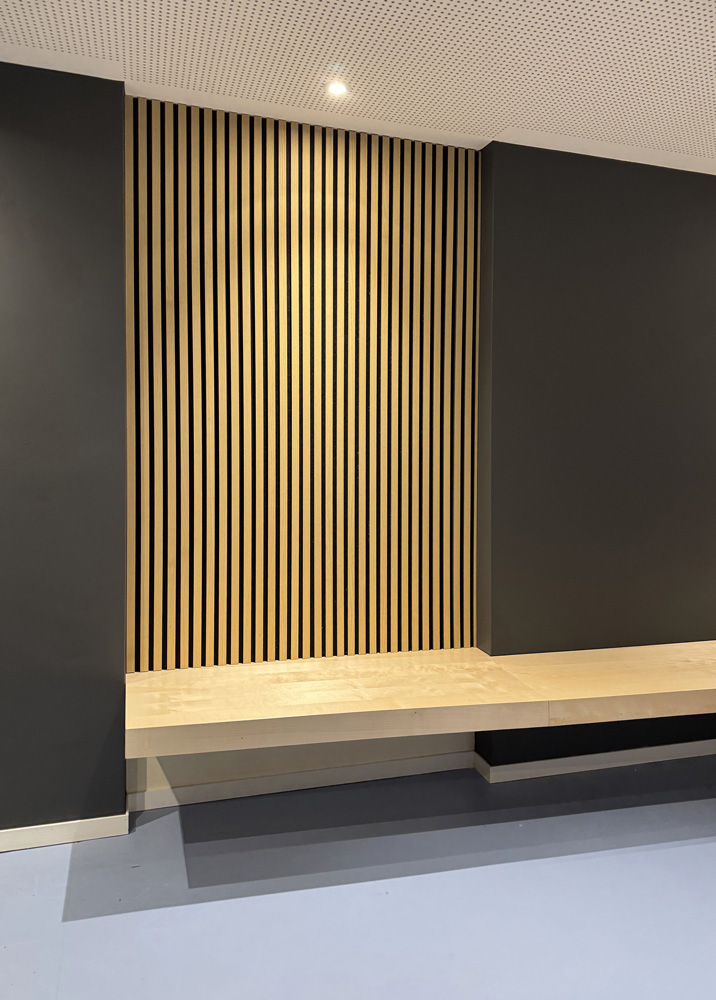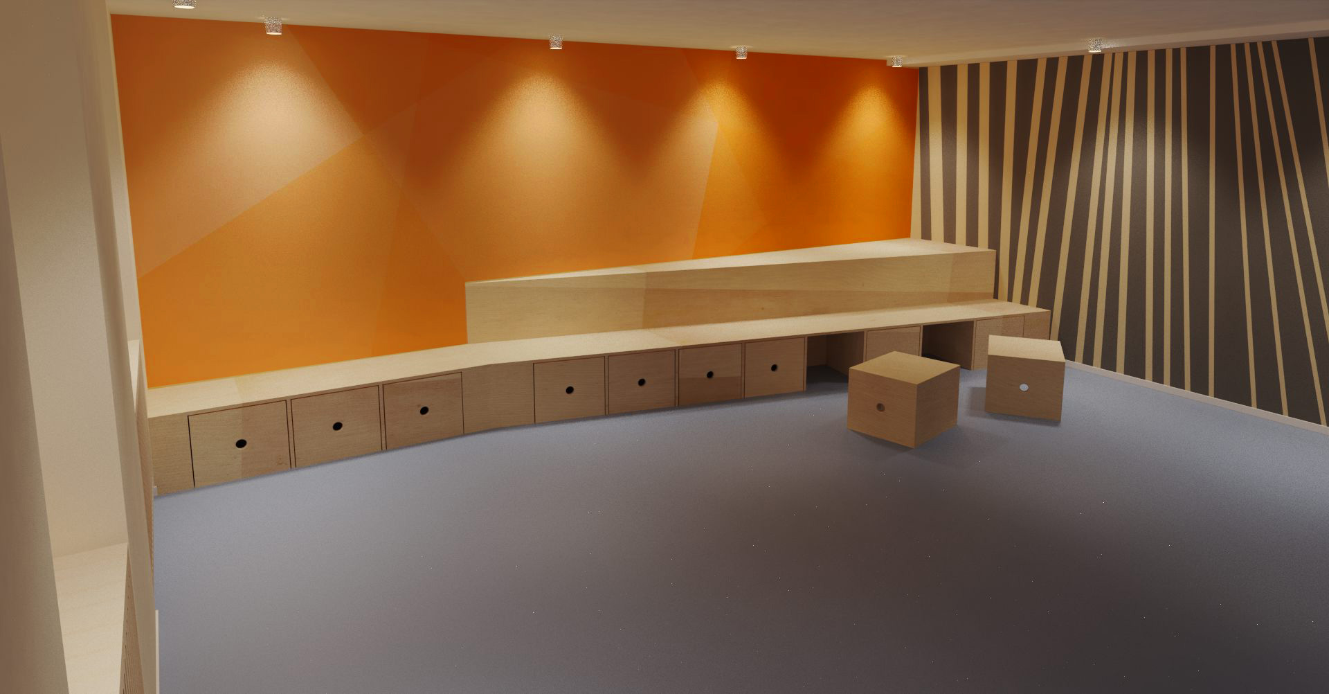 Der Raum ist klar in zwei Bereiche gegliedert. In der aktiven Zone stehen Tischtennis und Kicker im Mittelpunkt – ein lebendiger Ort für Spiel, Bewegung und spontane Begegnungen. Ein großzügiges Sitzpodest ergänzt diesen Bereich und bietet Platz zum Zuschauen oder einfach zum Dabeisein. Integrierte, flexibel nutzbare Hocker sorgen dafür, dass sich der Raum schnell an unterschiedliche Situationen anpassen lässt. Auch die Fensternischen wurden funktional weitergedacht und bieten nun zusätzliche Sitz- und Stehmöglichkeiten.